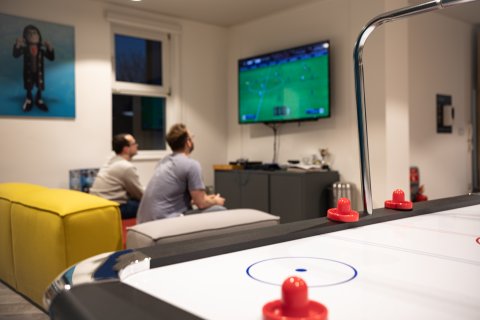 At our new-and-improved studio, we have a newly-fitted kitchen/café space, as well as a tea and coffee point closer to our open-plan work area. We also have cosy, private meeting pods, meeting rooms with beautiful views over the town, and a gaming area for breaks and our regular social evenings and events.